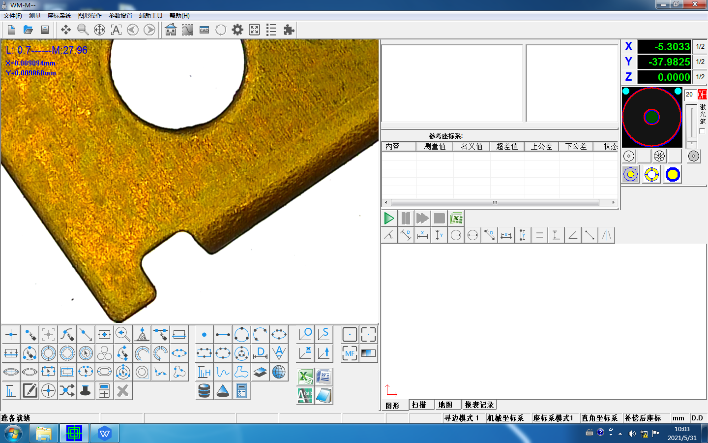 1 | 丰富的几何测量功能(点、直线、圆、圆弧、椭圆、矩形、槽形、○形环、 距离、角度、开云线,闭云线,,曲线)等。 |